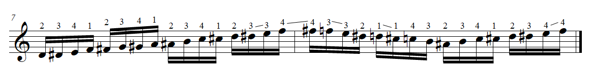 Not only does this passage create a lot of tension for the intense battle moment, but it makes one blistering technical warm up for us guitarists (especially at 𝅘𝅥 = 190!). The fingerings in the examples should help for those who wish to learn it, I mapped it out at 11th position on the D-string, and it ascends to the 9th position on the e-string for the higher notes. The full Finale score of this passage is attached below!